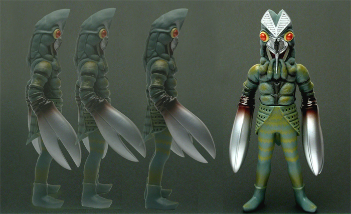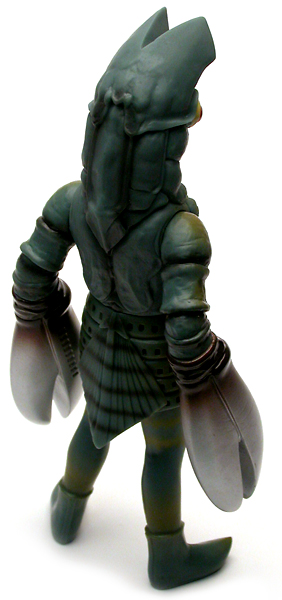 このソフビ、580円だったけど良く出来てます。この後ろ姿なんか妙にリアルで気持ち悪さが倍増してますねぇ。僕は昆虫が大嫌いなので、蝉の抜け殻さえも触ることが出来ないのに、このバルタン星人は好きです。なぜなのか分んないけど、ま、人間が演じているっていうのを知ってるからですかね?(神原)