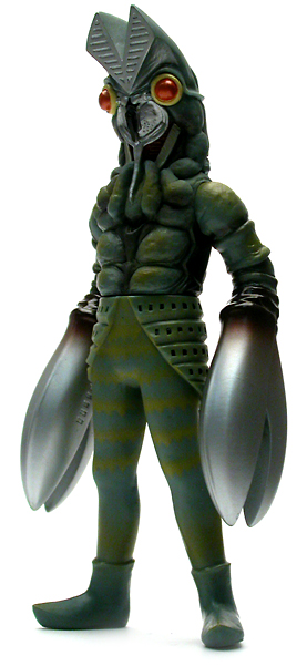 ウルトラマン第2話「侵略者を撃て」に登場。 ・ 身長:ミクロ〜50メートル ・ 体重:最大2万トン 蝉に似た顔、細くとがった口吻、ザリガニのような大きなハサミ状の手をもった直立二足歩行型で、高度の知能を備えた異星人である。本来は、侵略目的で地球を訪れたのではなく、故郷であるバルタン星が発狂した科学者による核実験により破滅し、偶々宇宙旅行中であった20億3000万人のみが運良くこれから逃れ、その身をバクテリア大に縮小して放浪の旅を続けていたところ、地球を発見して宇宙船の修理を目的として来訪した。初期の科特隊員との会話の中で地球人が持つ生命の概念を理解できない様子を見せており、地球人とは異なる生命観ないし価値観を持つことが推測される。(「ウィキペディア」より)